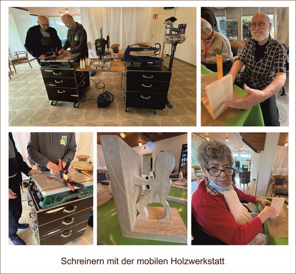 Zum zweiten Mal hatten wir Besuch der anderen Art im Hause: Schreinermeister Tobias Marquardt von der „Werkzeugkiste“ stellte seine mobile Holzwerkstatt bei uns auf und führte gemeinsam mit interessierten Bewohnenden einen kleinen, aber sehr feinen Handwerkskurs durch. Geschreinert wurden sehr hübsche Bücherhalter und „immerwährende Kalender“. Die Bewohnenden waren mit großem Eifer und Spaß dabei. Einige brachten direkt ihre früheren handwerklichen Erfahrungen ein: So zum Beispiel Herr Szala, der selbst Tischler von Beruf ist und während des Kurses mit großer Akribie arbeitete. Andere näherten sich ganz neu dem Werkstoff Holz und probierten sich mutig aus. Die Teilnehmer erhielten nicht nur das benötigte Material, sondern auch professionelle Unterstützung beim Messen, Sägen, Schleifen und Verleimen. Es wurde aber nicht nur konzentriert gewerkelt: Immer wieder entstanden kleine Fachgespräche über Werkzeuge, alte Berufe oder frühere Projekte, an die man sich gerne erinnerte. Und natürlich wurde gescherzt und gelacht.
